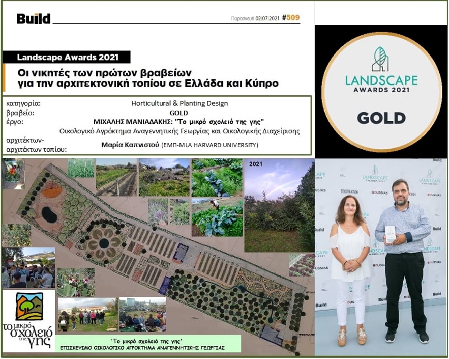 ΧΡΥΣΗ ΒΡΑΒΕΥΣΗ ΣΕ ΔΙΑΓΩΝΙΣΜΟ ΑΡΧΙΤΕΚΤΟΝΙΚΗΣ ΤΟΠΙΟΥ ΕΛΛΑΔΑΣ ΚΑΙ ΚΥΠΡΟΥ Ιούλιος 2021 ‘Τα πρώτα βραβεία για την αρχιτεκτονική τοπίου στην Ελλάδα και Κύπρο ολοκληρώθηκαν αναδεικνύοντας τα έργα και τους δημιουργούς τους που ξεχωρίζουν και βάζουν τον πήχη ψηλά για όλες τις μελλοντικές δημιουργίες. Τα βραβεία διοργανώθηκαν υπό την σημαντική αιγίδα του Πανελλήνιου Συλλόγου Αρχιτεκτόνων Τοπίου.’ (Landscape Awards 2021, Δελτίο Τύπου, Αθήνα, 02 Ιουλίου 2021) Με ‘Το μικρό σχολειό της γης’ πήραμε μέρος στον παραπάνω διαγωνισμό και θέλουμε να μοιραστούμε μαζί σας τη χαρά μας που διακριθήκαμε στην κατηγορία μας και βραβευτήκαμε με το ΧΡΥΣΟ!!! Στο διαγωνισμό συμμετείχαν καταξιωμένοι Αρχιτέκτονες, Αρχιτέκτονες Τοπίου, σημαντικά και μεγάλα Γραφεία Μελετών, δημόσια και ιδιωτικά Έργα. Την κριτική επιτροπή αποτελούσε μια 20σαμελή ομάδα από διεθνούς κύρους αρχιτέκτονες, αρχιτέκτονες τοπίου, διδάκτορες φωτογραφίας κτιρίων…
