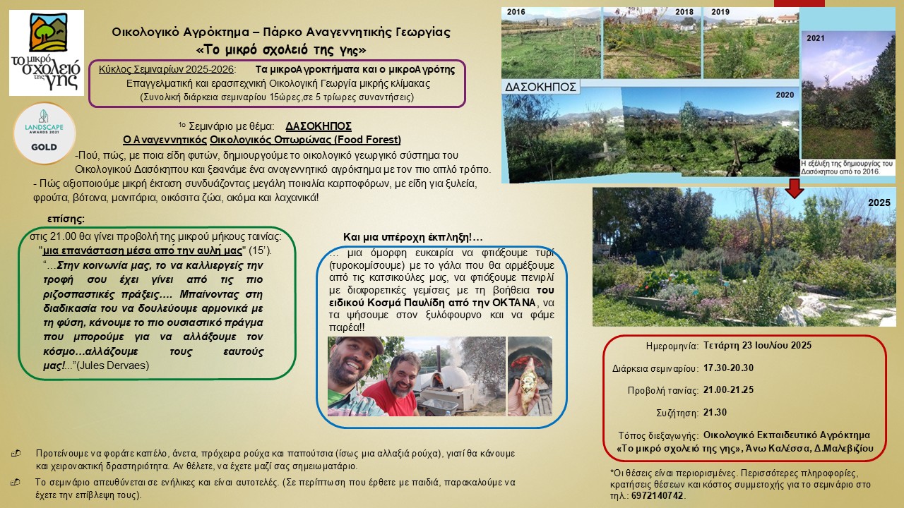 Πως να ξεκινήσετε το δικό σας “παράδεισο” με τον πιο απλό και αποτελεσματικό τρόπο! “Στο μικρό σχολειό της γης” στα Άνω Καλέσσα, 15′ από το Ηράκλειο. Τετάρτη 23-7-2025 στις 17¨30. Περιορισμένες θέσεις όπως πάντα, κάντε έγκαιρα την κράτηση σας. Πληροφορίες – κρατήσεις στο αφισάκι και στο 6972140742!